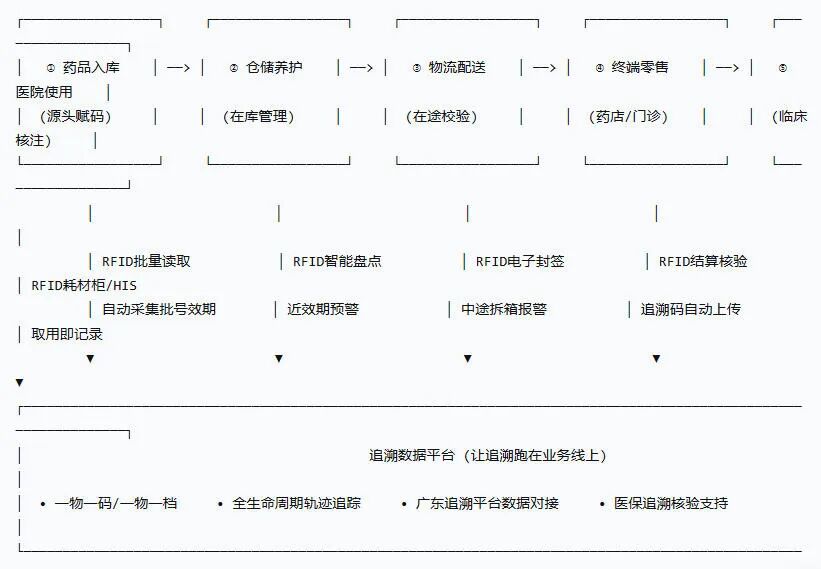 围绕广东《方案》中提出的经营、使用全链条要求,斯科结合多年医疗与药品场景经验,构建了一套覆盖药品入库、仓储养护、物流配送、终端零售、医院使用的RFID解决方案,让追溯真正跑在业务线上。